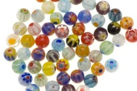 Millefiori Beads. This technique for making glass comes from Italy and is translated as “Thousands of Flowers”. The process involves making glass rods with patterns in the centre. When the rods are cut the pattern is revealed – like seaside rock. The beads are cut from rods and shaped toshow these lovely flower patterns in many different colours. Due to this process the patterns can vary in shape and designs may be irregular.