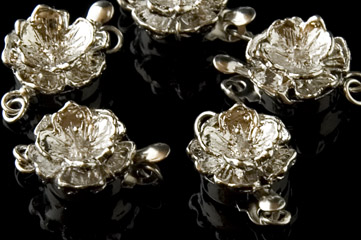 Silver coloured raised flower 12mm by 17mm to include loops, single strand.