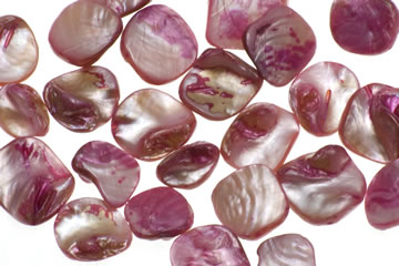 Individual shaped and drilledshell. One side smooth the other with ridge, tooth effect. Sizes vary 8mm and 15mm. The pink colour has a slight reddish tint.