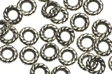 Twisted rope in a ring 15mm diameter, 6mm hole.  Group together as spacers on projects using thick threads.