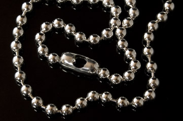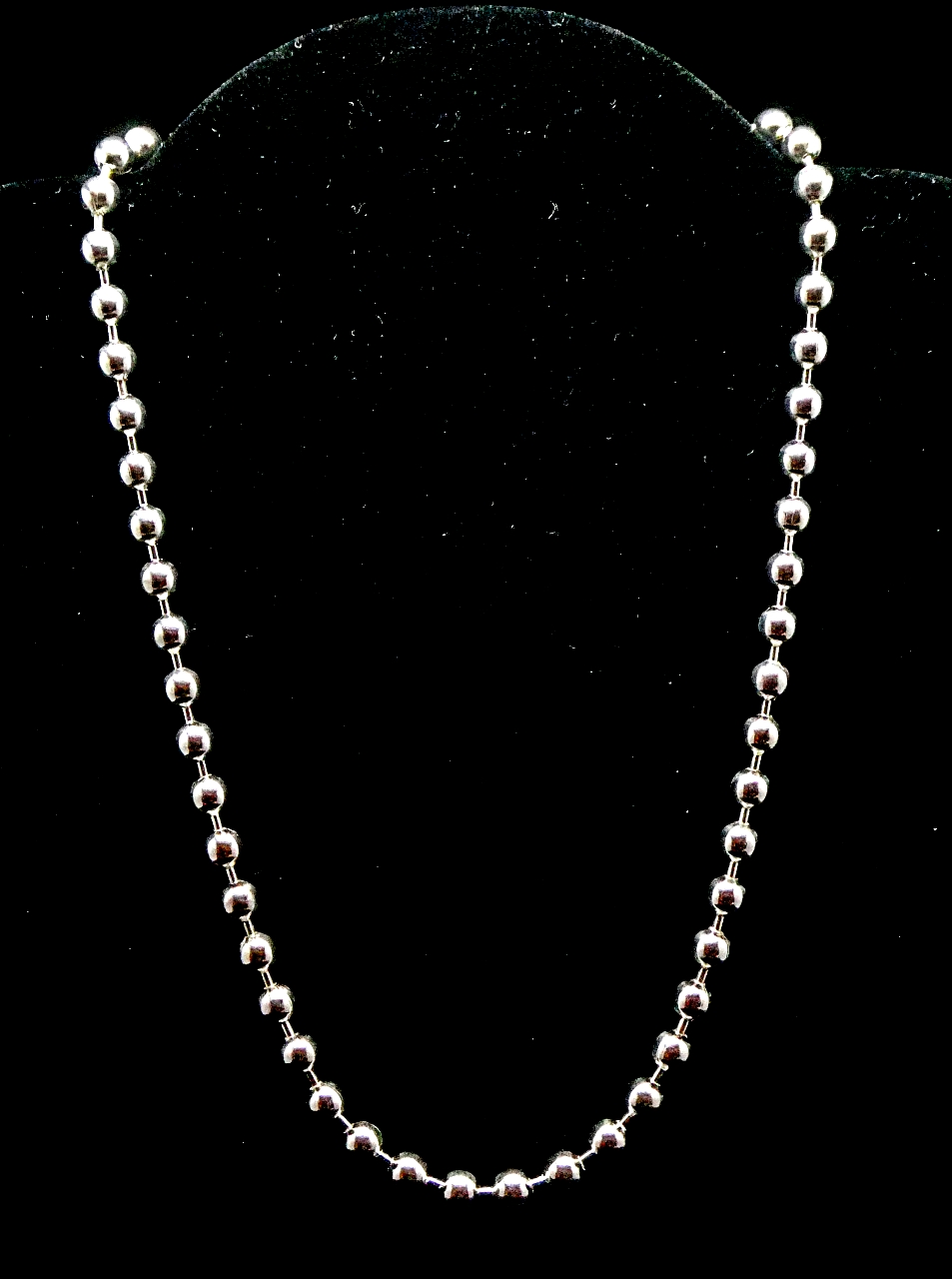 Finished necklace chain 18in / 46cm. Has appearance of a heavy chain but is light to wear. Succession of 6mm balls with a large clasp, a pendant or feature bead could be attached to this clasp and worn at the front.