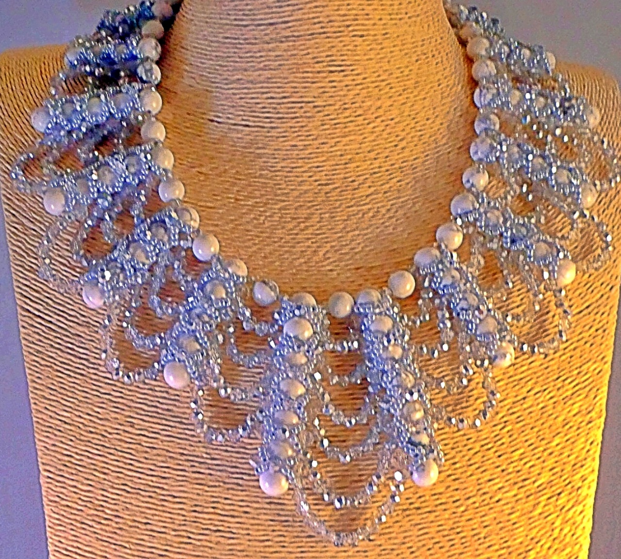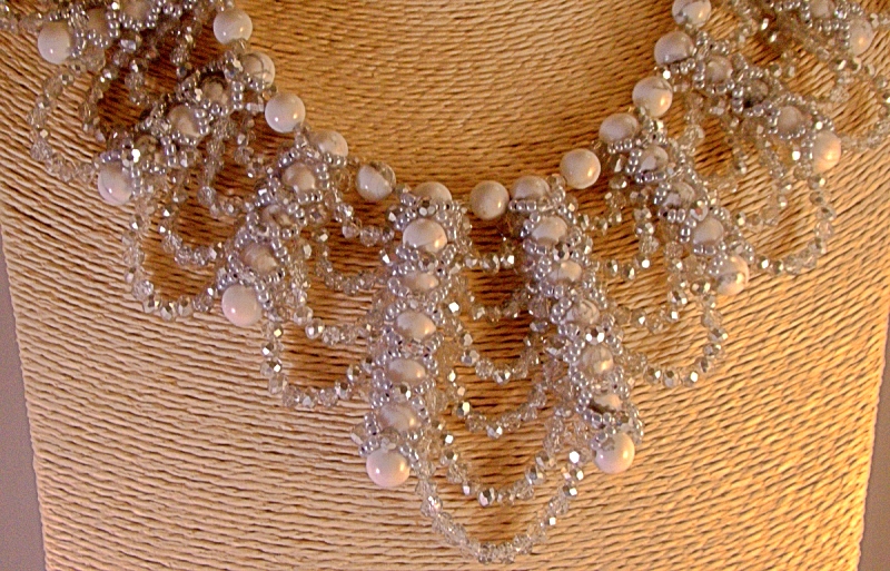 Individual beaded lace style collar. White Howlite beads mixed with crystal style Fire Polished Glass. Fits close to the neck approximately 15 inches for inner measurement with clasp and extender chain Extends 3 inches at centre front, decreasing to 1.25 inches at back.
